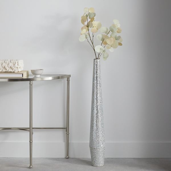 Bring a touch of modern sophistication to your decor with the Crackled Silver Mosaic Floor Vase. Crafted from metal, this stylish vase is a statement piece that effortlessly elevates any room. It's perfect for adding a contemporary touch to your living room, bedroom, or office.
