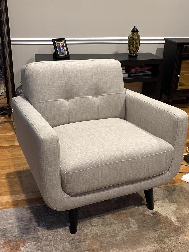 Lounge in the coolest of style on our sumptuous Hadley chair. This contemporary, mid-mod seat features textured taupe upholstery that's both cool and classy with a rounded base that curves into supportive arms, creating a timeless modern piece for any room in your home. Tapered wooden peg legs support Hadley and provide a stunning addition to the overall personality.