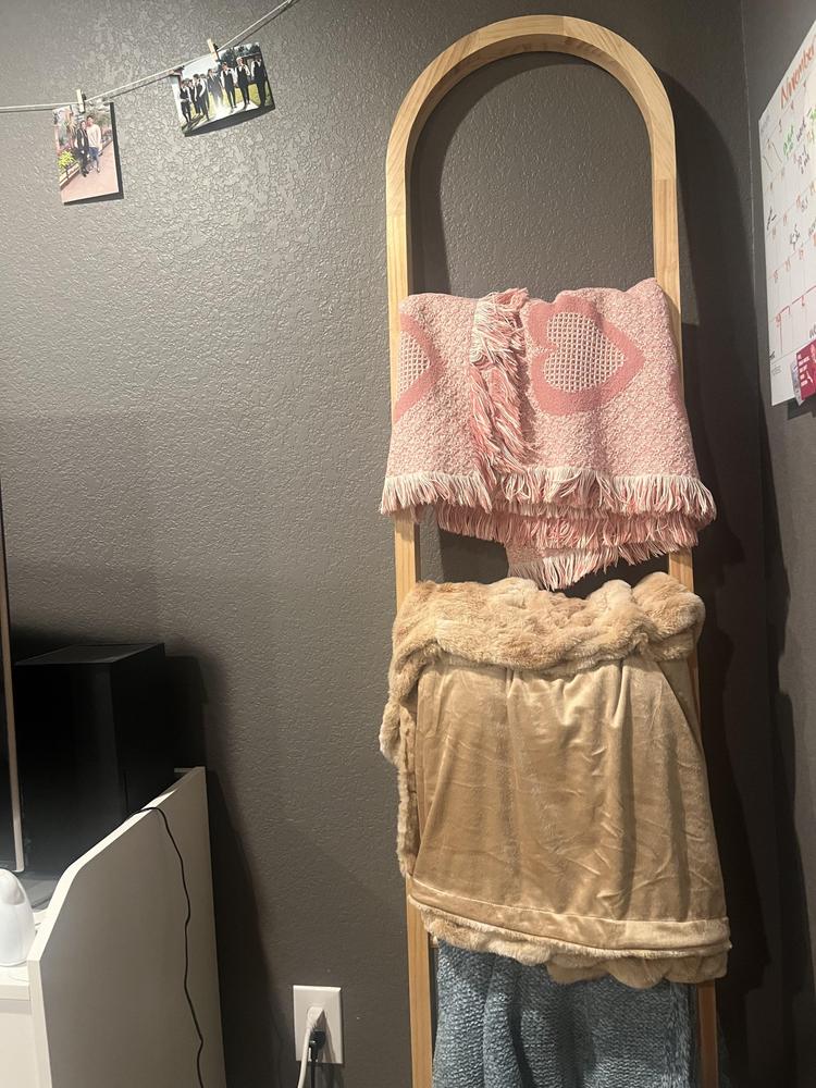 Holds 3-4 good sized throw blankets! Wood material sturdy and smooth. Collected as part of a promotion.