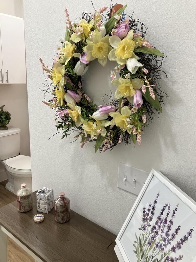Modern farmhouse meets At Home prices in Honeybloom, our exclusive brand that celebrates life lived together. This charming 22in. Honeybloom Daffodils and Tulips Wreath is the perfect way to brighten up your home decor, adding a touch of elegance and the essence of a blossoming garden with its beautiful floral and leafy design. The wonderful pink and yellow flowers combined with the delicate green leaves create a stunning visual that will make your space feel like a peaceful sanctuary. Handcrafted with care, this wreath features lifelike faux flowers that capture the essence of real blossoms, allowing you to savor the beauty of spring all year round. Whether it's hanging on your front door, adorning your fireplace, or adding a pop of color to any wall, this wreath is sure to enchant your guests and create a warm and inviting atmosphere.