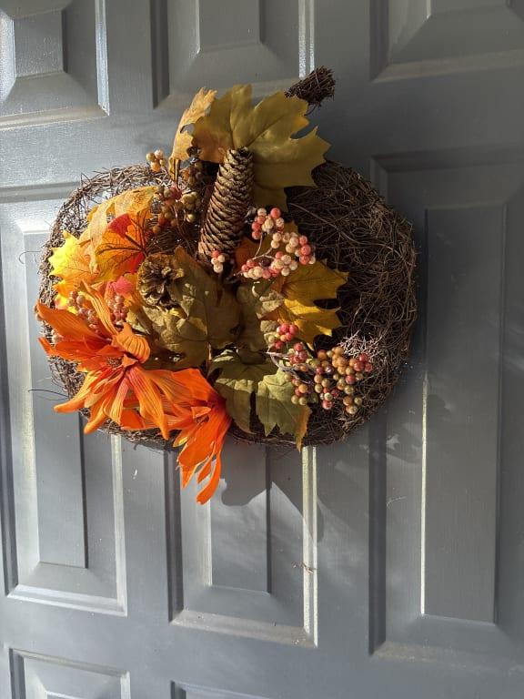 Delight in the autumnal charm that emanates from this unique wreath. Its colorful dahlia, pinecone, berries, and maple leaf designs add a touch of nature-inspired beauty to your home, making it a delightful centerpiece for your fall festivities.