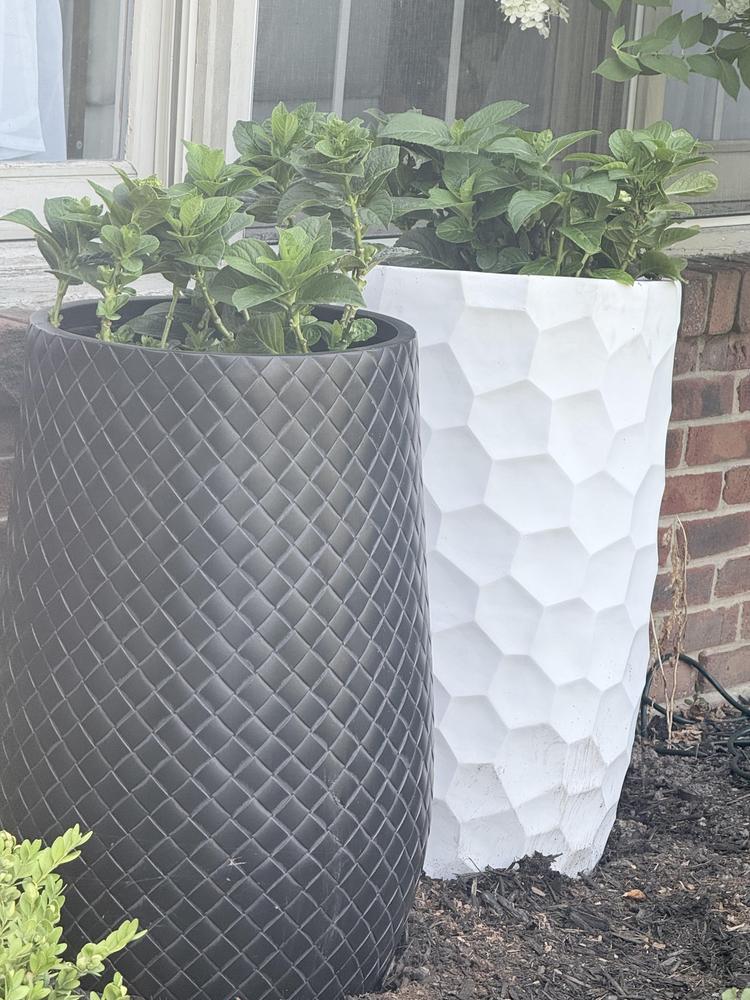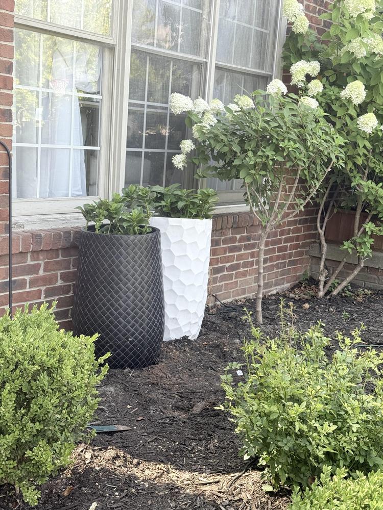 Don't leave your fabulous foliage relegated to the garden! Add a dash of architectural and botanical beauty to your porch, patio or sunroom with our tall white Elena cylindrical dimpled synthetic planter. Designed to live both indoors and out, this large 30in. pot is crafted from a weather-resistant synthetic material that stands up to the UV light shining down, rainstorms and regular watering.