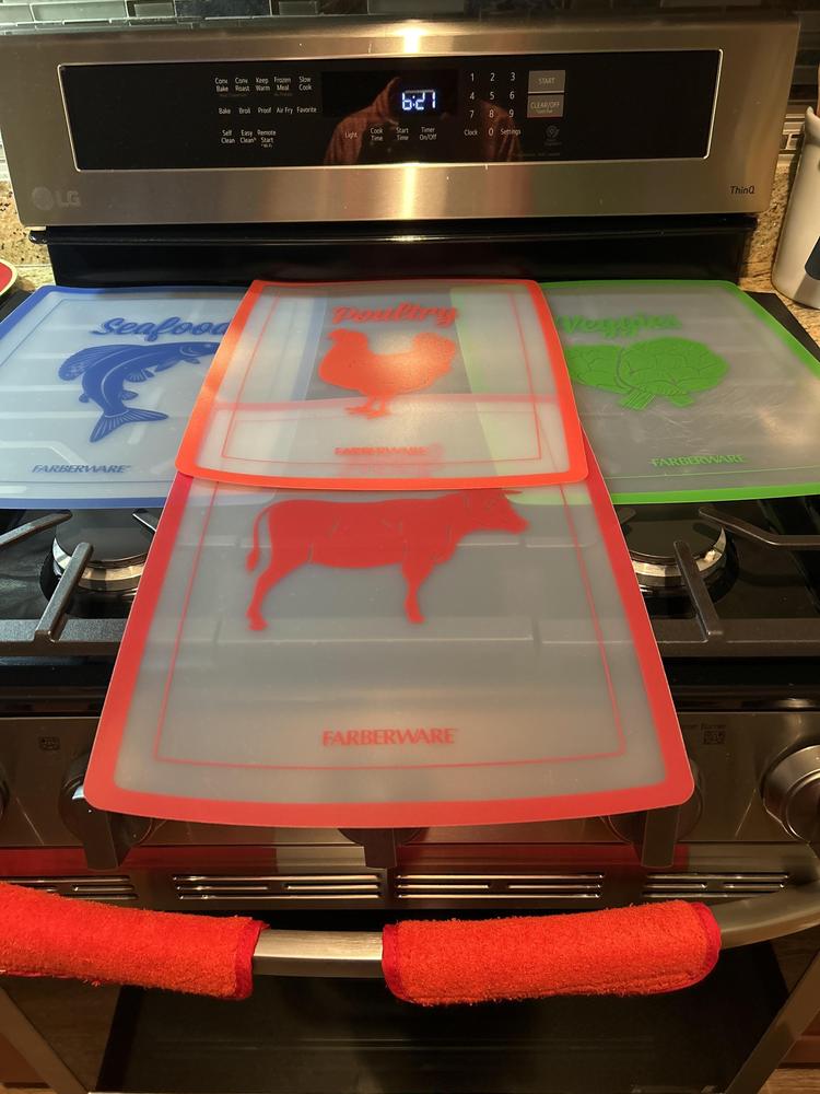 Made of durable plastic, these designated cutting mats are not only easy to clean, but also help you maintain a tidy workspace. The set includes four mats in different colors and designs, allowing you to keep track of which mat is reserved for meats, vegetables, or fruits, helping you prevent cross-contamination and cut down on prep time.