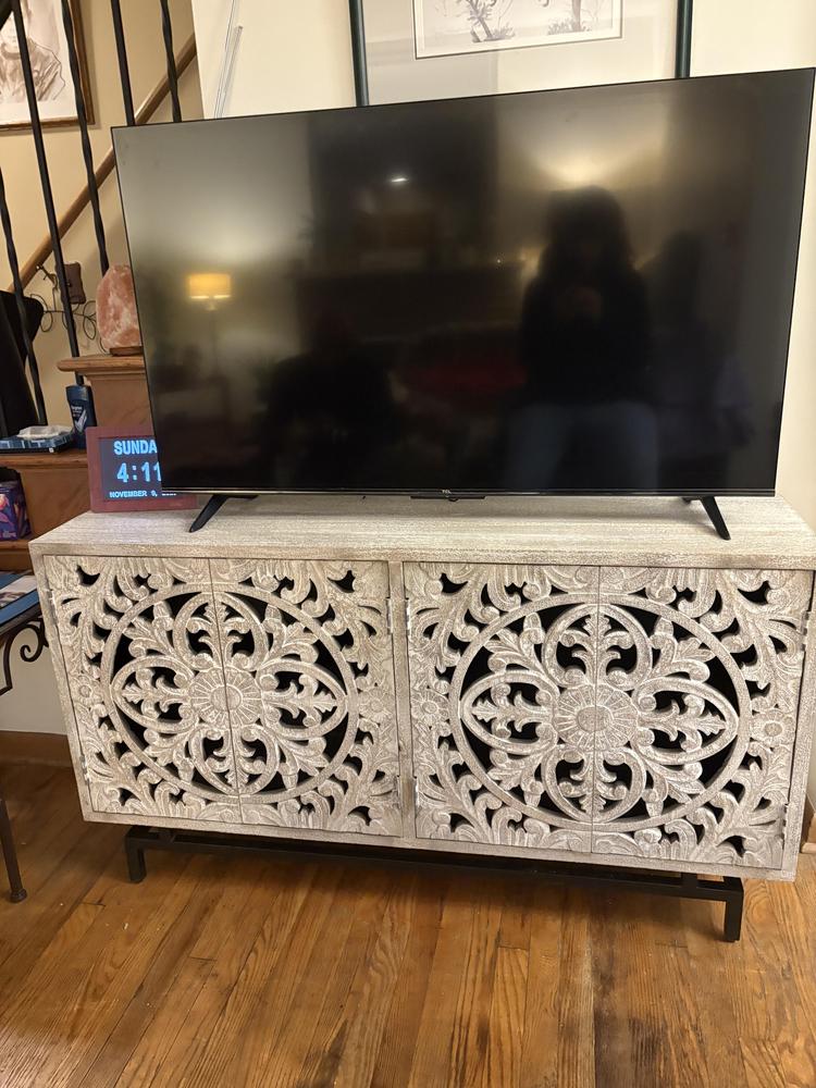 Found & Fable is a new collection that lets you explore what's right around the corner. Choose your own adventure every day. Savor it all and say yes to what comes next—exclusively At Home. Add an exotic accent to your living room, dining room, bedroom, or kitchen with our carved 4-door sideboard. Crafted from wood and metal, this piece features carved unique designs on its panel doors and distressed weathering for an antique look. Doors open up to reveal an interior shelf and space for books, dishes, and other personal items. It's not only an accent cabinet but also a unique designed piece of artwork to decorate your house.