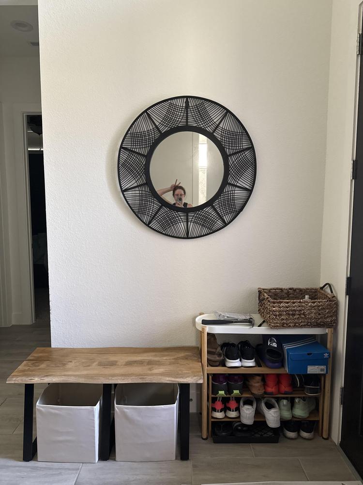 Whether you're looking at one last glimpse before you leave the house, or just brighten up your living spaces, adding a mirror like this one is a great option for a useful, decorative accent in your home. Reflect on this, our black woven bamboo circular round mirror is a gleaming touch for any living space. And since mirrors have the added bonus of reflecting light, this piece, wall mounted, or leaning is sure to make a living room or bedroom feel even larger.