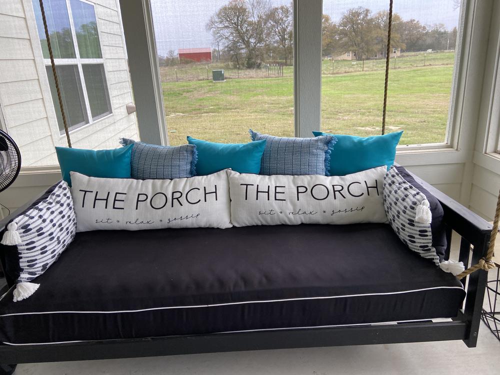 Bring a touch of modern style to your outdoor oasis with the Crosby St. Black and White Textured Lumbar Outdoor Throw Pillow with Tassels. Its eye-catching black and white color scheme adds a contemporary vibe to any patio or backyard seating area.