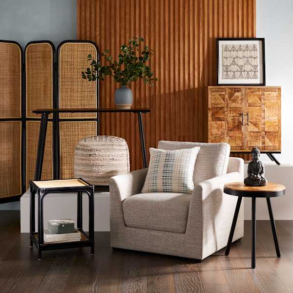 Found & Fable is a new collection that lets you explore what's right around the corner. Choose your own adventure every day. Savor it all and say yes to what comes next - exclusively At Home. Create your own unique indoor setting with our wonderful saffron colored end table. Crafted of wood and manufactured wood, this convenient table delivers a wonderfully sophisticated look that's ready for any decor situation.