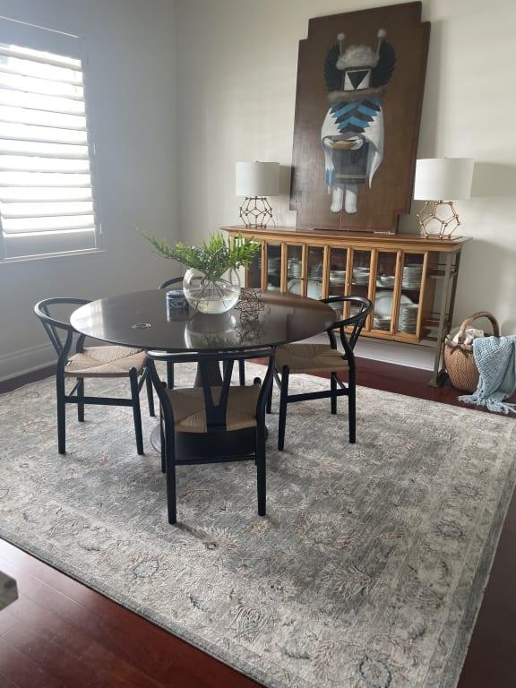 Found & Fable is a new collection that lets you explore what's right around the corner. Choose your own adventure every day. Savor it all and say yes to what comes next-exclusively At Home. Bring modern bistro style to your dining room with this set of two black and rattan Denise wishbone dining chairs. We love using this set on its own as accent furniture or in multiples around a table. Each chair is made of painted black wood and natural woven seat. It features a rounded spindle back and an open lumbar area.