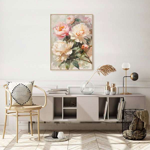 Add soft color and calm to your space with this Framed Pink Floral Canvas Wall Art. Painterly blooms and airy brushstrokes create a gentle botanical scene on textured canvas, set off by a sleek framed edge. The large scale at 31x41in. with a 2in. profile makes an elegant statement above a sofa, bed, or console. Its timeless style pairs effortlessly with modern, transitional, or farmhouse decor. Use it as living room wall decor, bedroom wall art, or an entryway focal point. A beautiful floral print that refreshes your walls with a light, uplifting touch.