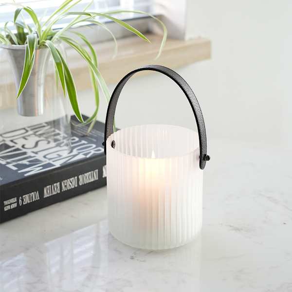 Round out your indoor or outdoor decor's visual appeal with our 5in. Frosted Ribbed Glass Lantern with Black Leather Handle that showcases a wonderful frosted glass design. This candle holder's architectural details add a pop to your look, while the design's ribbed finish blends effortlessly into any color palette. Set this piece inside with your favorite pillar candle and it'll round out your space with wonderful coordinating decor.