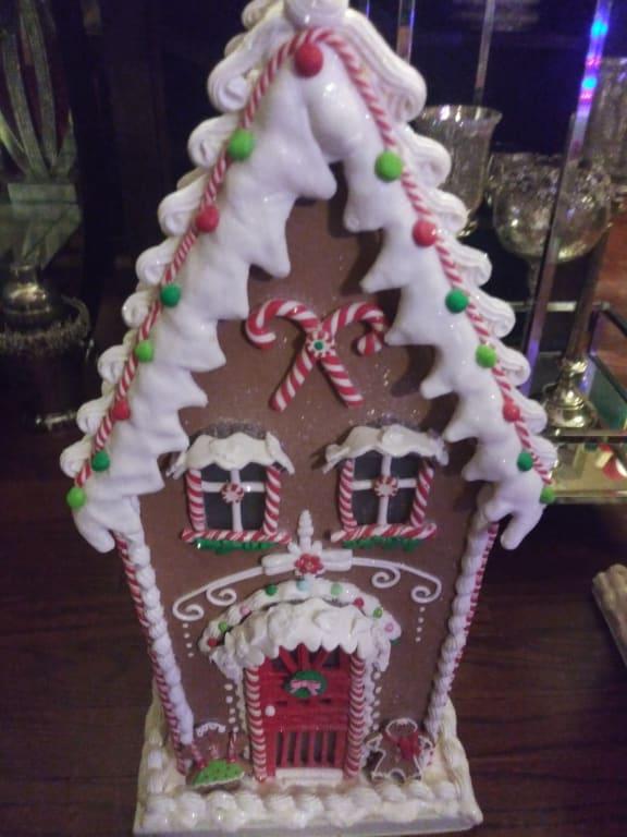 All your Christmas favorites get a gingerbread twist, with gumdrops and peppermints and a glittery-dusted finish with items from our Gingerbread Lane Collection. Light up your holiday scene with this 26in. pre-lit gingerbread clay house, dressed in multicolor details and sparkling snow-like accents. Warm LEDs glow through the windows and along the roofline, bringing cozy charm to mantels, consoles, and shelves. Striped trim, scalloped roof edges, and playful textures create a storybook look that fits right in with your Christmas village. Perfect as a tabletop centerpiece or entryway accent, it sets a festive tone the moment you switch it on.