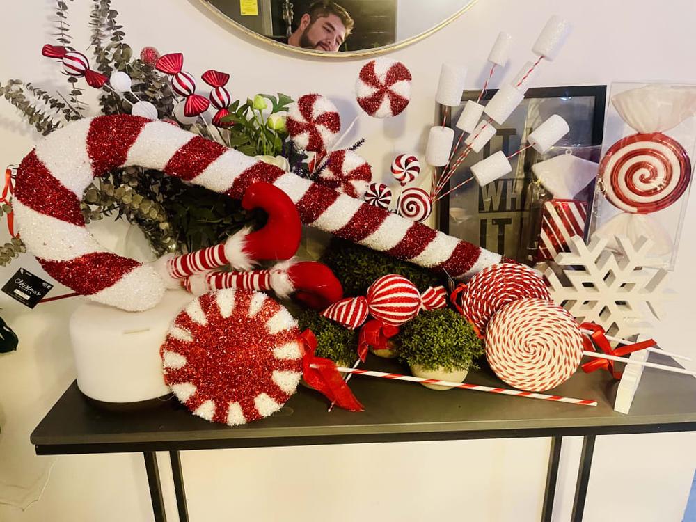 The 28in. Red and White Lollipop Pick is a delightful eye-catcher made from a mix of styrofoam and plastic. Perfect for adding a whimsical touch, this pick is a versatile decoration for any festive occasion.