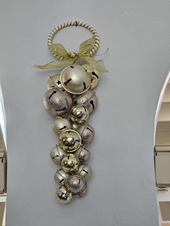 Our 15in. gold bell jingle bell door hanger will be the perfect welcome and creates the holiday vibe you're looking for. Constructed of metal, it's all about the details of this festive work of art from our Classic Christmas Collection. This door hanger is ready to welcome guests-Happy Holidays!