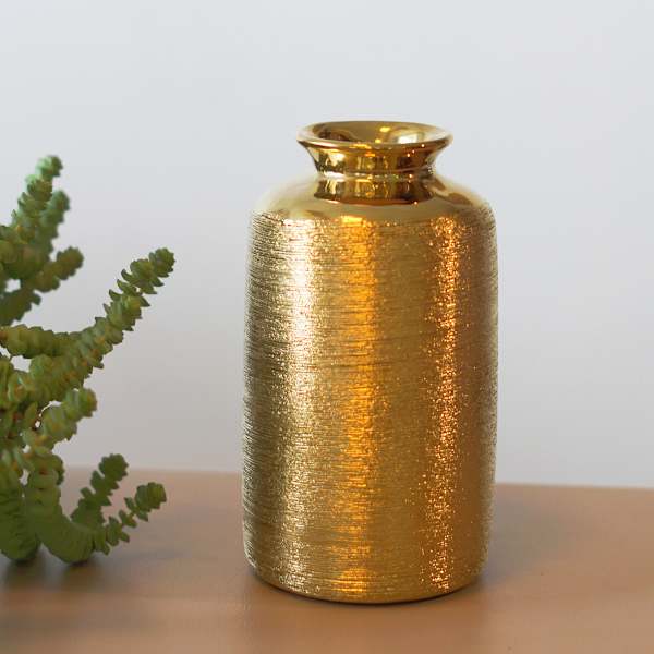 If your decor aesthetic is wide open, our 8in. Gold Ceramic Vase may be the element your home's been missing. This metallic vase is absolutely superb with its interesting shape and brilliant patina. Place it in your entryway, on the hearth or on a counter to add an amazing twist to your decor.