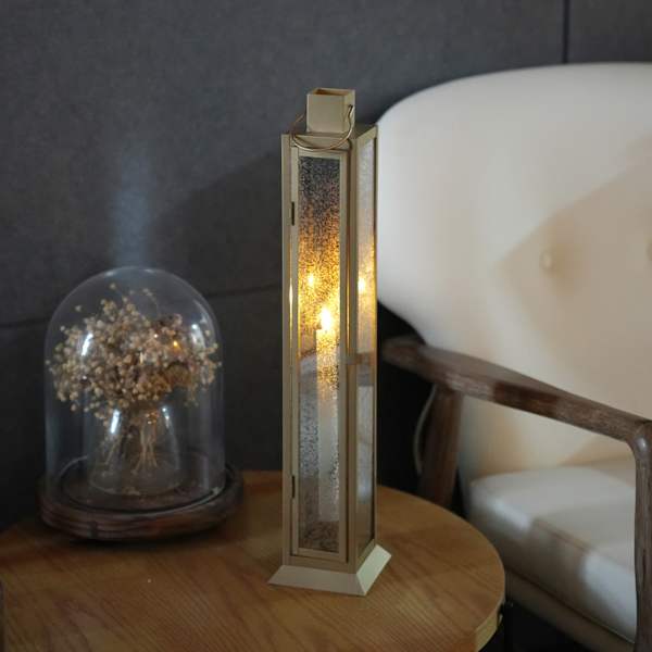 Bring a soft, inviting glow to any room with this Gold LED Taper Lantern in champagne mercury glass. The speckled mercury glass diffuses light beautifully, framed by a metallic gold metal body for a clean, timeless look. Its cuboid silhouette stands 21in. tall with a slim 4in. footprint, perfect for mantels, consoles, and shelves. Style one as a focal point or flank an entryway with a matching pair. The flameless LED taper delivers warm ambience with effortless ease. A versatile gold mercury glass lantern that complements modern and classic decor alike.