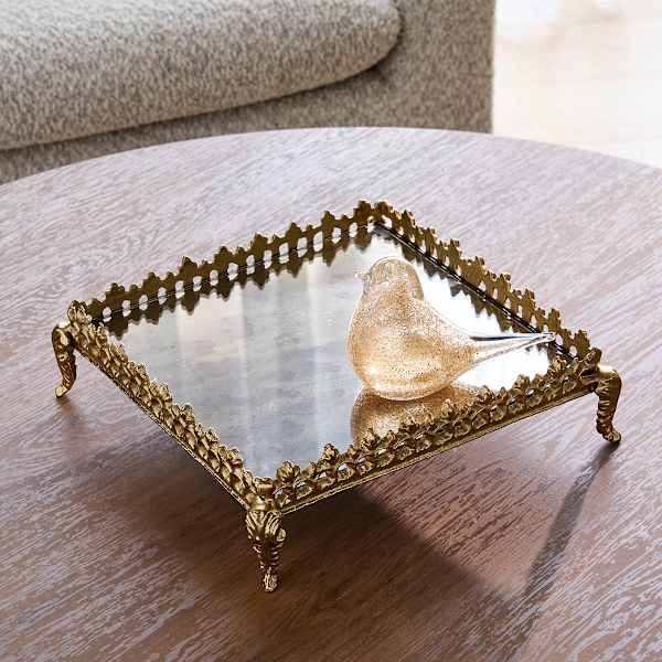 Elevate your display with this 11in. gold metal square mirror pedestal tray. The reflective mirrored surface and clean square silhouette bring a timeless touch to vanities, coffee tables, and entryways. A raised pedestal base adds height and presence while the metal frame neatly outlines your arrangement. Style it with candles, perfumes, jewelry, or small decor accents for a polished focal point.