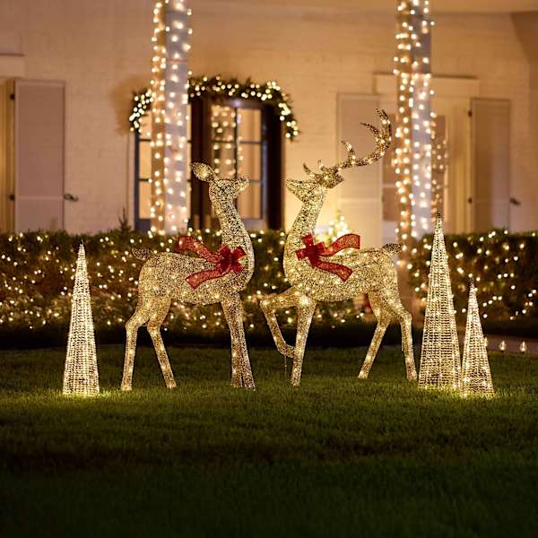 Display a refinement of traditional holiday sentiments in an elevated look with rich details and lavish layers of golden hues with items from our Golden Noel Collection. Add instant sparkle to your space with the Golden Noel Set of 3 LED Gold Cone Trees. This trio of slim, metallic gold cones glows from within, casting a soft, steady glow with plug-in LED lighting; no batteries, no fuss. Graduated heights make styling easy on a mantel, console, or entryway, whether grouped together or spaced apart. Crafted from plastic with a sleek metallic finish, they bring a polished seasonal touch without taking up much room.