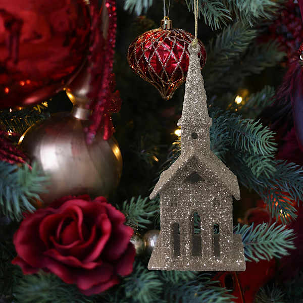 Enjoy a refinement of traditional holiday sentiments in an elevated look with rich details and lavish layers of golden hues with items from our Golden Noel Collection. Bring classic cheer to your holiday decor with the 6in. Glitter Church Ornament. It tucks neatly among branches, garlands, and wreaths. Lightweight plastic makes it easy to hang without weighing down the tree. The gleaming surface catches the lights for a warm, festive glow. Mix it with your favorite Christmas ornaments to spell out the season in style.