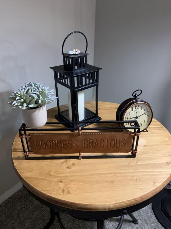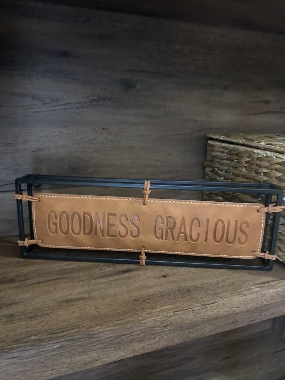 Transform any space into a delightful rustic haven with this charming metal and leather sign. Crafted with a creative saying, it brings a warm and inviting feel to any room in your home.