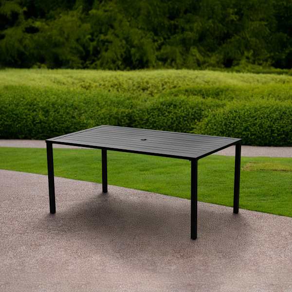 Finish out your outdoor dining arrangement or create a casual seating space with our black Grammercy steel slat outdoor dining table. This table is perfect for weathering the elements with its painted steel finish.