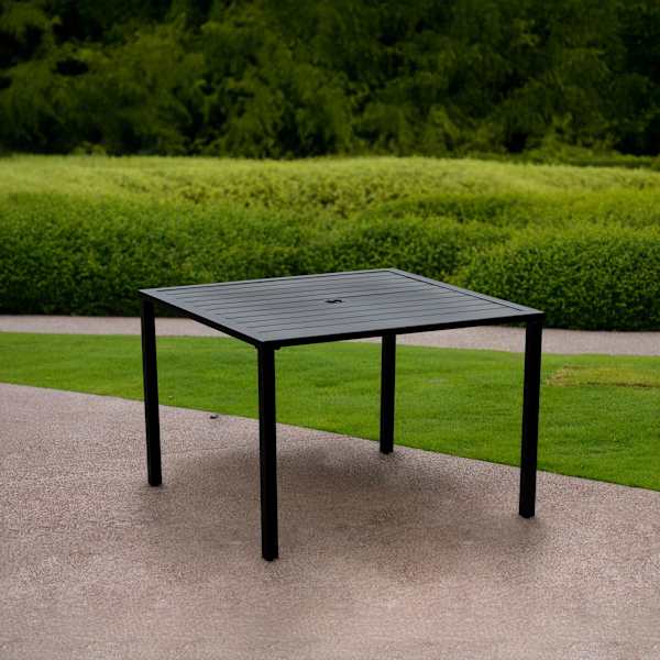 Modern design and unbeatable prices come together at Crosby St. only from At Home. Finish out your outdoor dining arrangement or create a casual seating space with our black Grammercy steel slat outdoor square dining table. This table is perfect for weathering the elements with its painted steel finish. Understated and featuring a slatted design, this square table will look great anywhere. Add an umbrella and have it made in the shade, as the table also features a center umbrella slot.