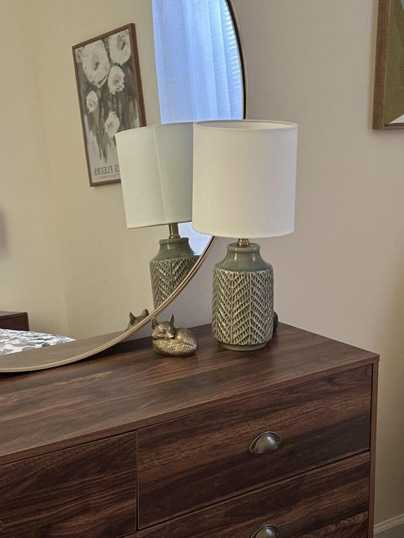 This charming table lamp is dappled in earthy green, blending with any decor. Its reactive textured ceramic design offers a natural elegance that feels organic and fresh, making it a welcome addition to any cozy corner.