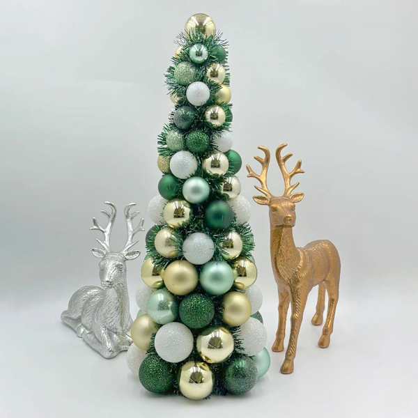 The 19-inch Green Ornament Tree brings a vibrant touch to your holiday decor. Made from shatterproof plastic, this ornament is both eye-catching and practical, seamlessly fitting into your festive arrangements.