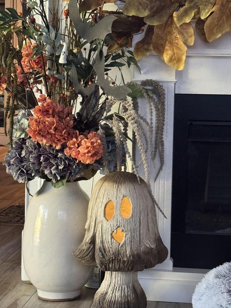 As pictured! Currently sitting atop my mantle. I adore this little guy.
