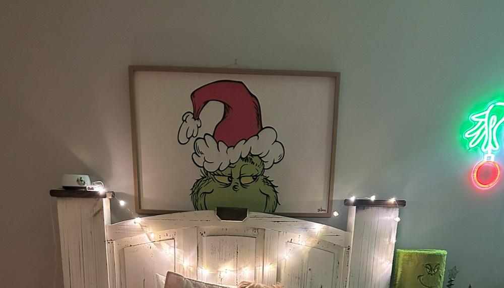 Bring home the iconic grin with the 24x36in. Grinch Face Print on Linen Wall Art. The bright green face and classic red hat pop against a natural linen texture, creating playful Christmas wall decor that instantly lifts the room. Crafted with a linen print and faux wood construction, it offers a warm, tactile look. This artwork makes a bold statement above a mantel, entryway, or living room sofa. The clean edges and modern scale pair well with farmhouse, contemporary, or eclectic holiday styles. A whimsical conversation starter that spreads festive cheer all season.