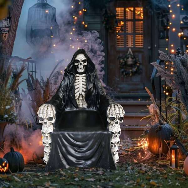 Bring out your gothic side with eerie elements like skulls, ravens and haunted houses with our Midnight Shadows Collection. Create an eerie place for the season's ghouls and trick-or-treaters to take a break, our 47in. Midnight Shadows Skeleton Throne Halloween Porch Decor is easily the most dramatic piece you'll display this year! Constructed of durable resin and plastic for strength and painted in gothic black and bone hues. This creepy fun Halloween furniture piece is a sure-fire conversation starter for all who come to your haunted home. Sit back and watch your seasonal visitors shriek in delight.