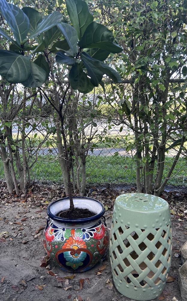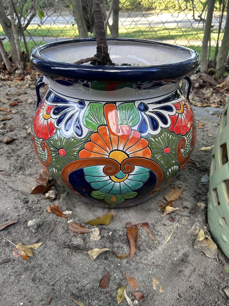Accent any room in your house with our 13in. multicolor Talavera ceramic pot. Painted in vivid colors, our medium sized, handled planter will perfectly blend in with any type of decoration in your living room, kitchen, office or patio.