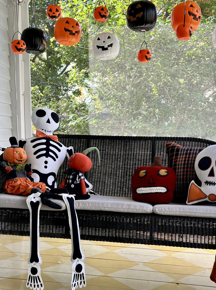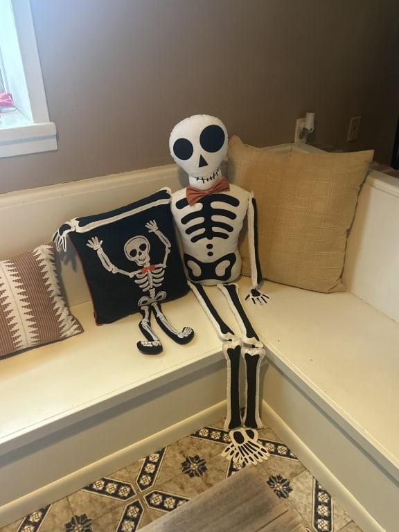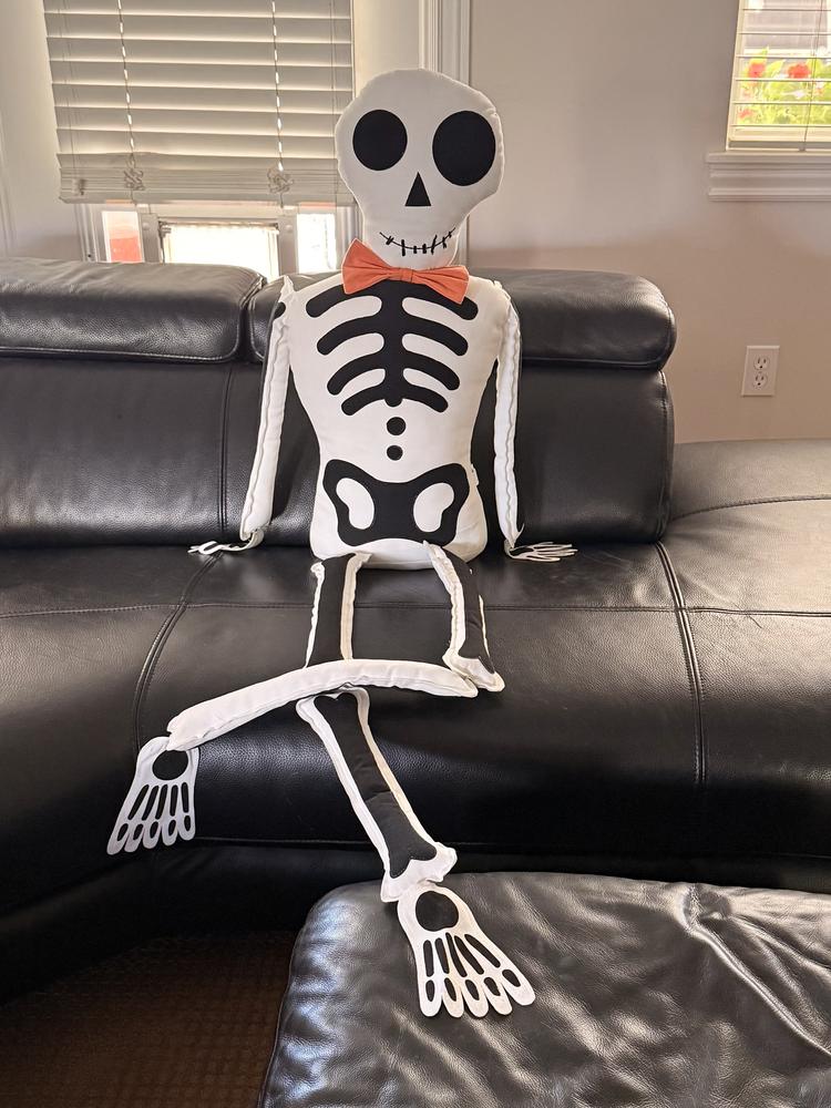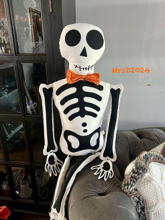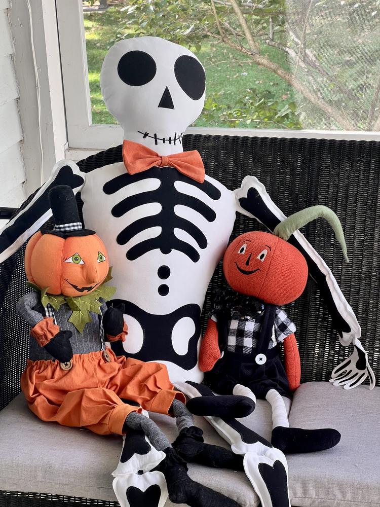 This Happy Haunting Pillow Set includes a 60" Fabric Skeleton Sitter, a 27x15 Jack-o'-Lantern trio throw pillow, a 6.5" fabric pumpkin and a 16" round black knit throw pillow.