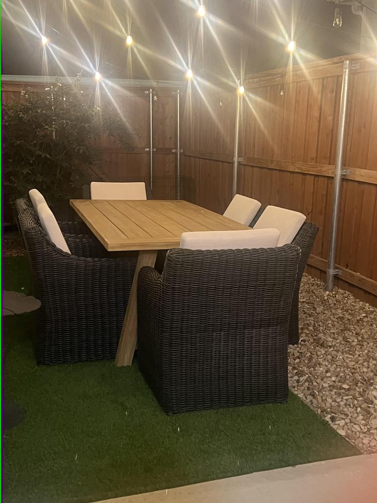 This table is a good price for the value! The wood is a beautiful light honey color, but not as yellow as pictured on the webpage, which I prefer. I did buy four Haven Blonde Acacia Wood & Tan Rope Patio Dining Chairs to go with it as pictured, and I love the look of the set together. I'm getting so many compliments from my family about how great it looks on our deck.