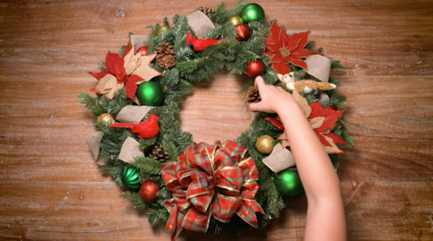 5. Finally, add holiday accents and ornaments into wreath and secure with floral wire.