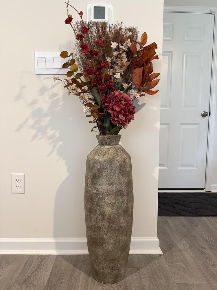 This stunning 30In. Grey Ceramic Oversized Vase effortlessly blends into any room with its sleek grey hue and striking Honeybloom decor theme. Made from porcelain, it's the ideal piece to highlight your most beloved flowers or stand alone as the focal point of your interior design.