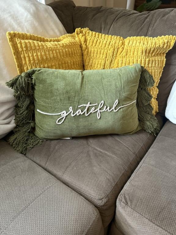 The Green "Grateful" Pillow with Tassels adds a burst of beauty to any room with its charming hue. Made from a cozy polyester/cotton blend, it's the perfect companion for sofa snuggling or lounging around.