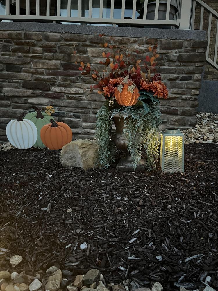 Modern farmhouse meets At Home prices in Honeybloom, our exclusive brand that celebrates life lived together. Add a charming touch to any outdoor space with our 10in. Honeybloom Green Honeycomb Outdoor Lantern. A realistic candle light within will automatically illuminate at dusk adding a magical glow to your garden. The simple green boxy lantern motif features an easy-use handle. This indoor/outdoor lantern will create a magical setting in your living room, garden or on your patio.