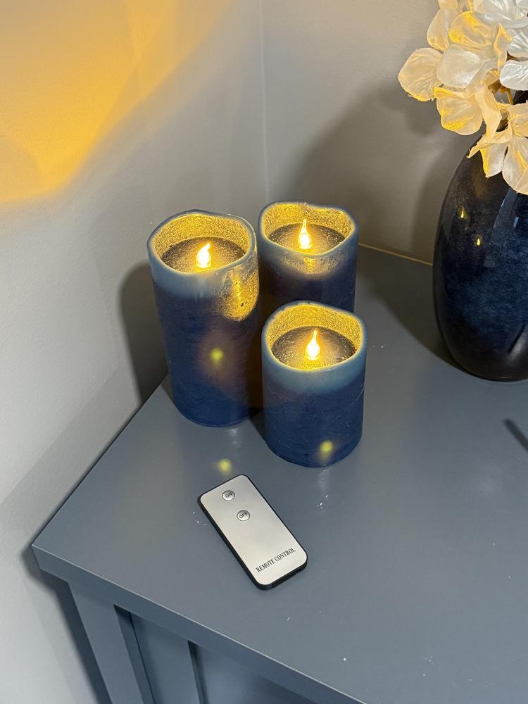 Set of 3 Dark Blue Wavy Top Wax LED Pillar Candles, 4"/5"/6"