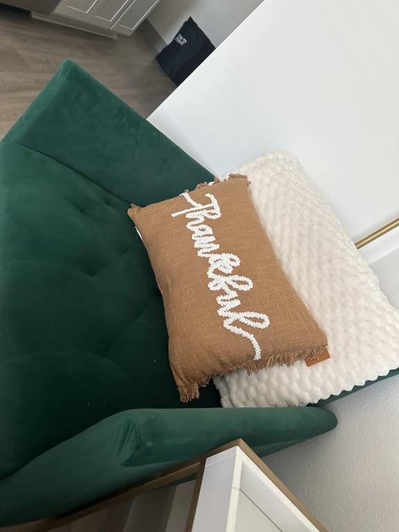 Adorned with playful fringe details and "Thankful" sentiment, it adds a stylish and whimsical touch to your decor. Express your thankfulness with this comfortable and chic accessory.