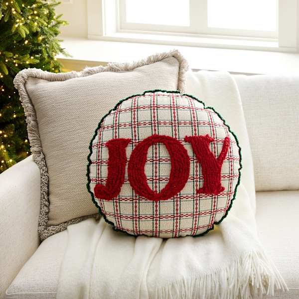 Bring merry style to your space with the 18in. "Joy" Embroidered Round Throw Pillow in classic red. The cotton cover showcases an embroidered design with festive detailing that stands out on its smooth, round silhouette. This pillow offers comfy support on your sofa, chair or bed. The vibrant color and timeless message instantly refresh your holiday decor. Mix it with plaids or neutrals for a cozy, cheerful look all season long.