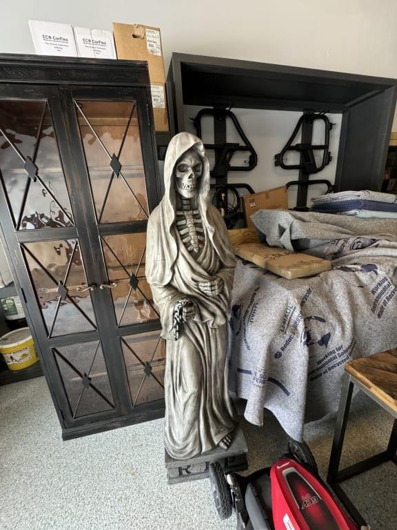 Bring your indoor or outdoor Halloween display to life, or should we say afterlife, with our 6ft. LED Grim Reaper Statue. Featuring a life-size silhouette, this eerie resin Halloween decoration is designed to shock all who grace its presence. The cloaked “RIP” skeleton reaper's ominous glowing eyes light up creating an unforgettable All Hallows Eve experience. Ideal for houses, yard displays, or indoor Halloween parties, it sets up in just minutes and is sure to have your visitors and guests shrieking in delight.