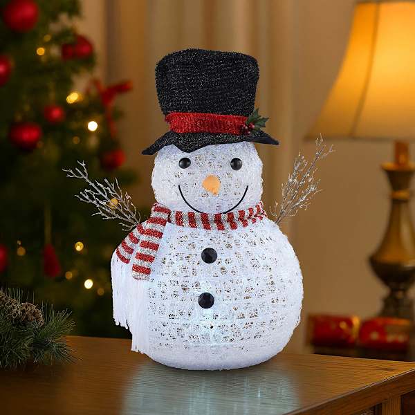 Bring a cheerful glow to your home with this 20in. LED Top Hat Snowman. The white fabric body shines with warm LED light to brighten mantels, shelves, and entryways. Classic details like a top hat and scarf create a timeless holiday look. With a compact footprint, it fits neatly on tabletops and small spaces. A charming indoor Christmas decoration that lights up your winter scene.