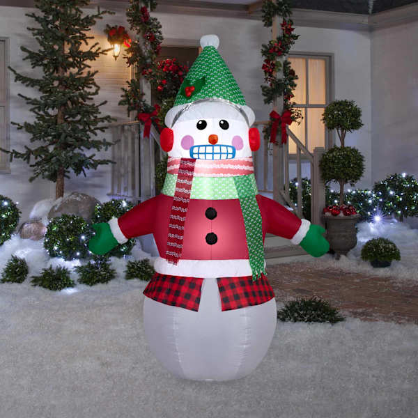Meet 6.5ft. Lighted Shivering Snowman Airblown Inflatable. Dressed in bright holiday hued accents and classic snowman details, this blow up captures that playful expression that'll make everyone smile. Plug-in LED lighting gives a warm, even glow that shines after dark. Crafted in polyester, this shivering character stands to make an easy winter holiday statement. This joyful centerpiece will set a fun holiday tone the moment it lights up.