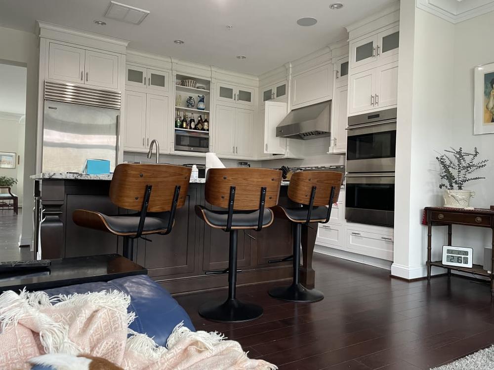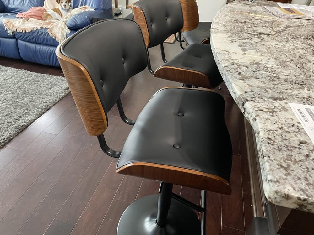 Amazing upgrade to my kitchen. Comfy and sleek. Love the wood/black leather combo.