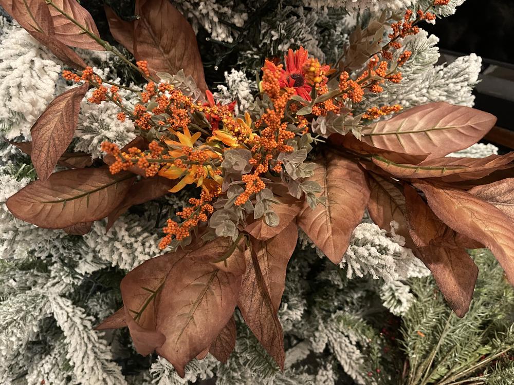 I decided to decorate my Christmas tree for fall this year. At Home’s floral section made it easy. These magnolia leaves are a good price and do a lot of work giving coverage to transform the tree. Great color that lets orange berries pop.