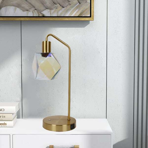 This Metal Task Desk Lamp with USB and Iridescent Geo Shade is a modern and stylish design that is a perfect fit for any desk or side table. The 19in. lamp arcs down to a cool glass shade. A clear LED bulb is perfect for a workspace while a trendy vintage Edison bulb is a great fit for a moody bedroom. The wonderful golden metal and glass styling will be a standout in any room of the house.