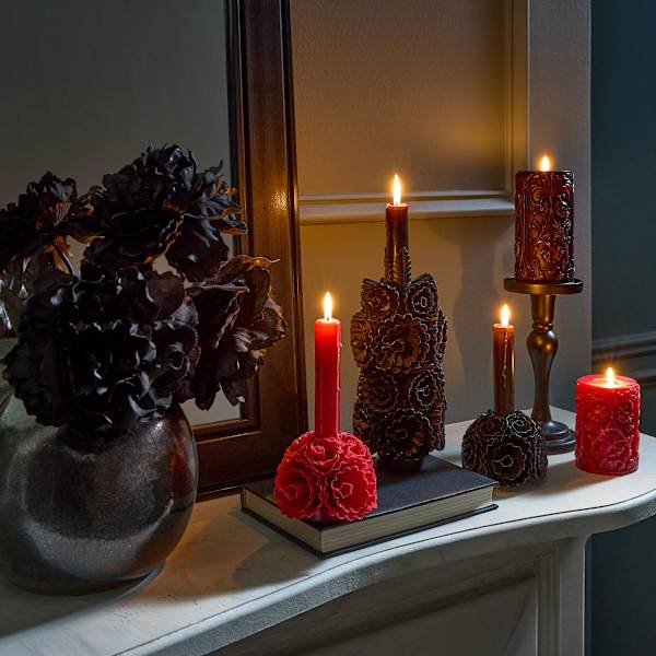 Bring out your gothic side with eerie elements like skulls, ravens and haunted houses with our Midnight Shadows Collection. Cast a warm glow over any space in your home with this hauntingly beautiful pillar candle. Made of poured black wax, this 3x6in. Midnight Shadows Black Ornate Pillar Candle comes with an embossed design that complements your existing Halloween arrangements and beyond. The intricately scrolled motif adds a touch of elegance to your indoor or covered outdoor Halloween displays. More than stylish, the anti-drip design is also smokeless so you can safely up the ambiance for the holiday season ahead. This wax pillar candle will enhance any candle holder where it's placed.