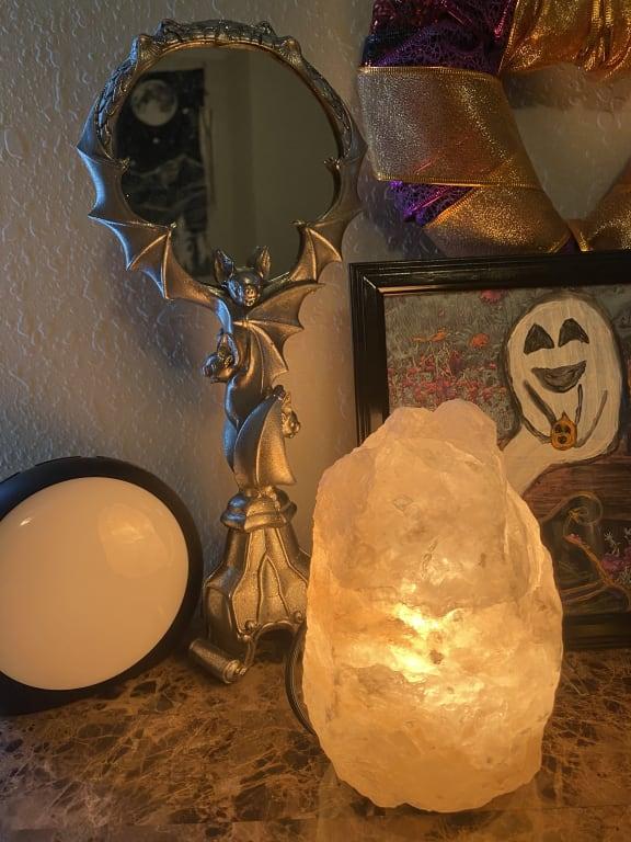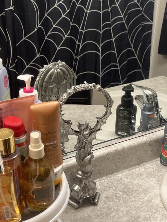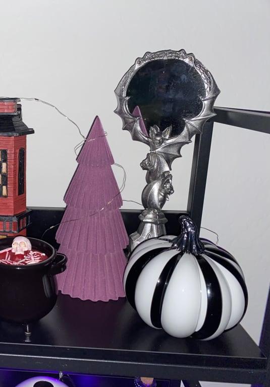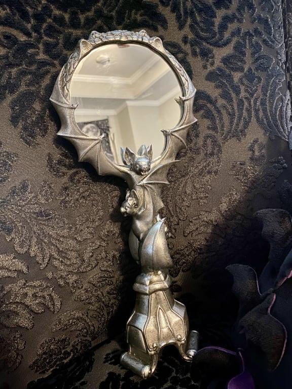 Set your sights on a spooky reflection with the Pumpkin Mirror on Bat Base. Crafted with care, this mirror stand perfectly captures the spirit of the season. The metallic shade adds a touch of mystique that will enchant any room with its haunting charm, casting an atmospheric glow.