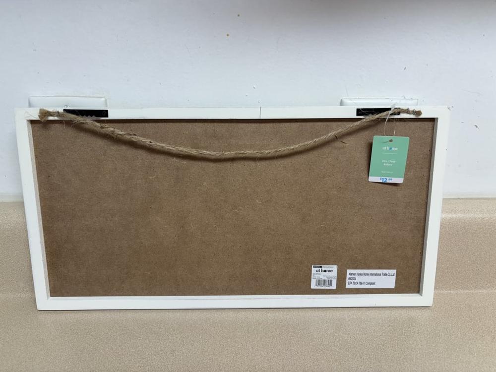 This is a really cute decor item. You can hang it by the two sawtooth hangers on the back, but I'll just use the twine hanger and save a nail hole in the wall. It was very well-wrapped in bubble wrap for shipping, but unfortunately, it was still damaged (crack in the frame). Rather than bother with returning it and getting an undamaged one (since my nearest store is 30 miles away), I requested a partial refund and At Home accommodated me. Collected as part of a promotion.