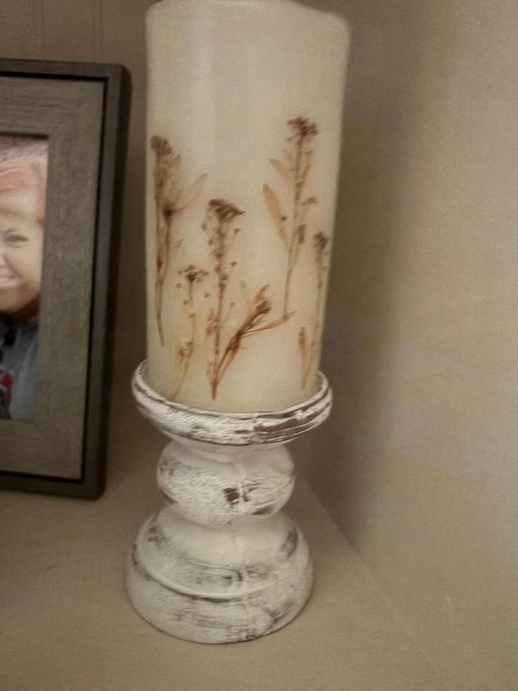 Distressed to look like a cherished family heirloom, this resin pillar candle holder is made to last. The flared top and base give it a classic silhouette and sturdy support, bringing a touch of rustic elegance to mantel or tabletop. Understated and versatile, this white resin candle holder pairs perfectly with vintage accents.